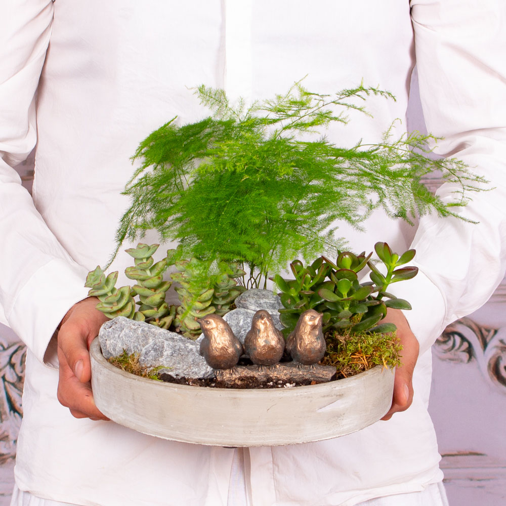 Aranjament zen cu plante suculente si asparagus