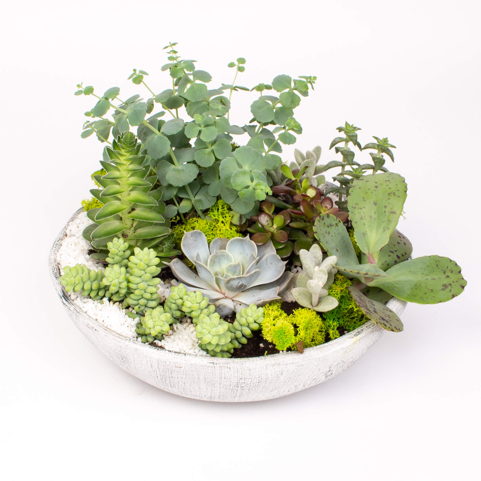 Contine: vas ceramic (30 x 9 cm), plante succulente si muschi conservat.