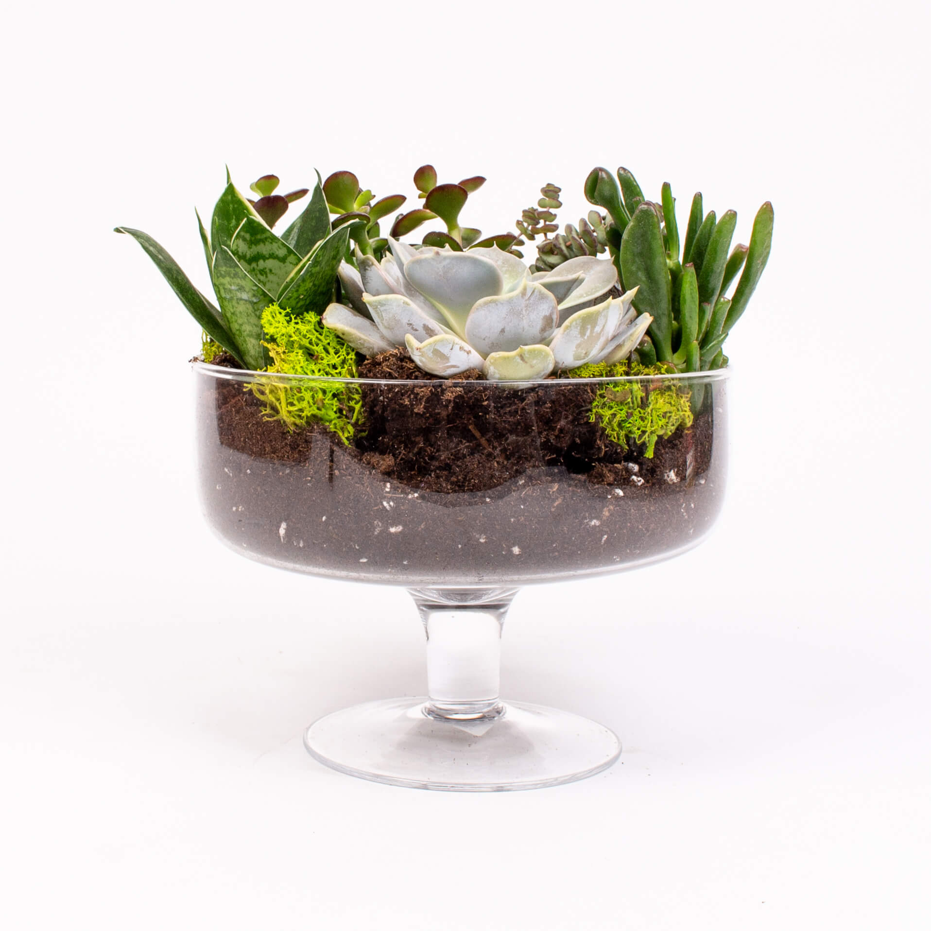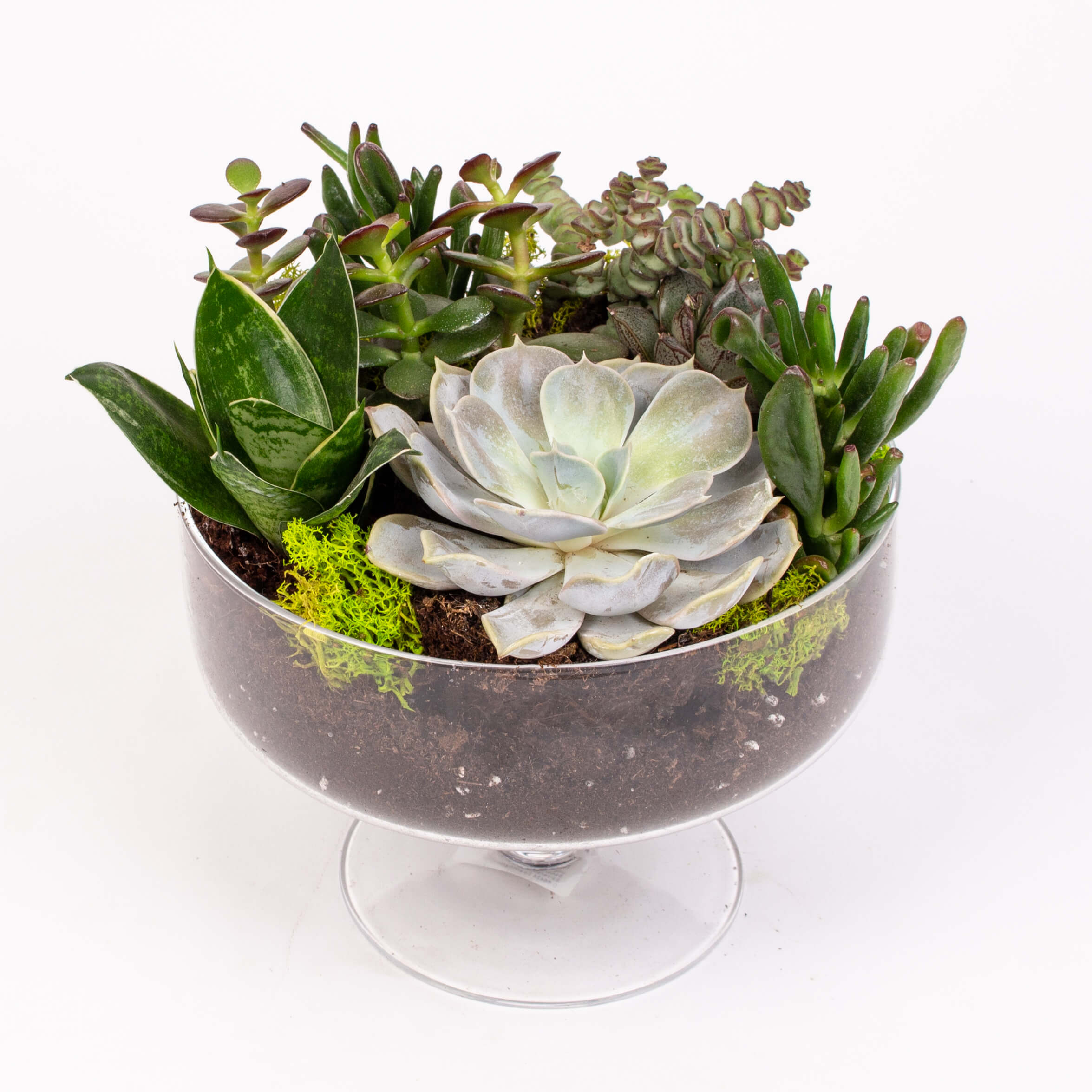Contine: vas de sticla (19 x 14 cm ) , plante suculente , muschi conservat.