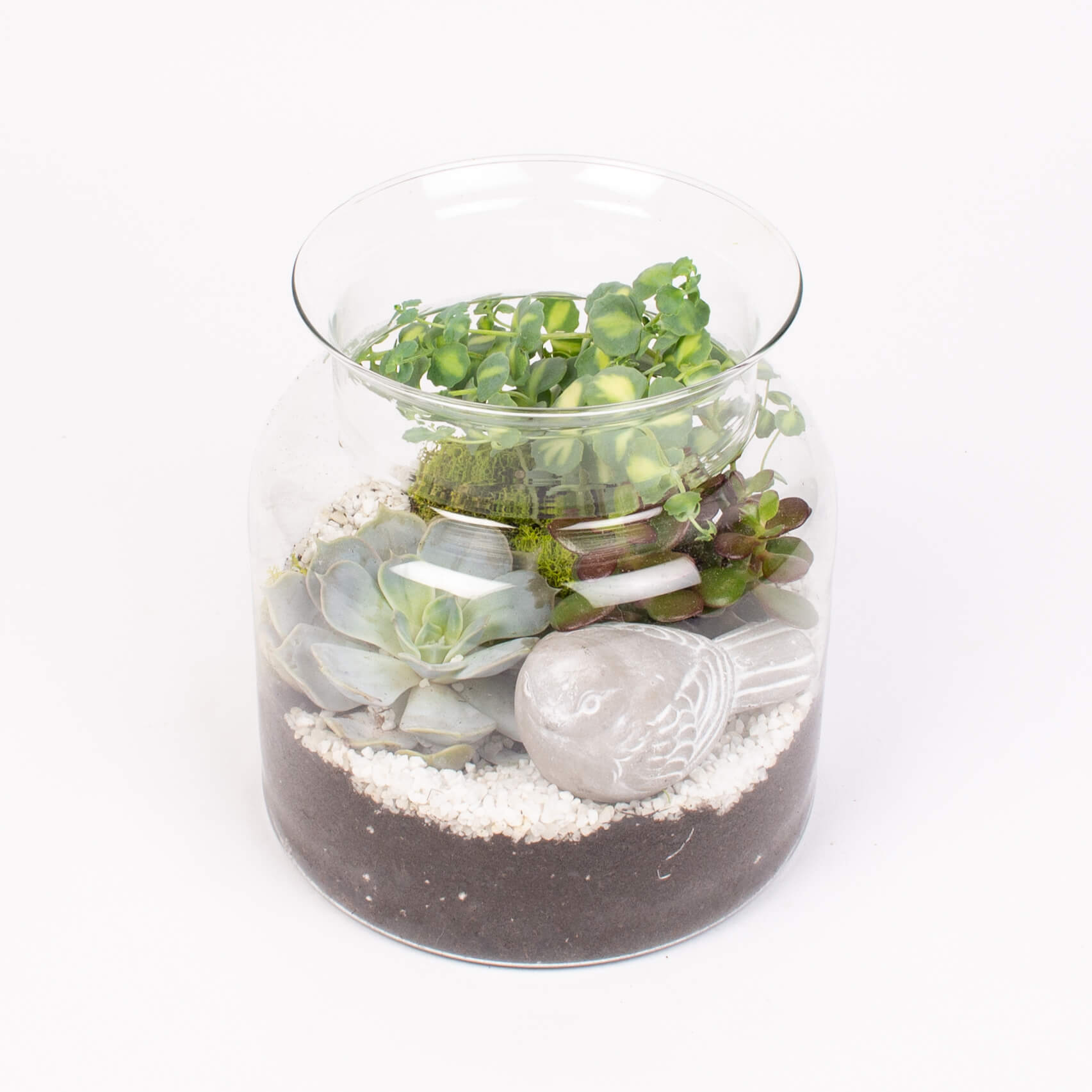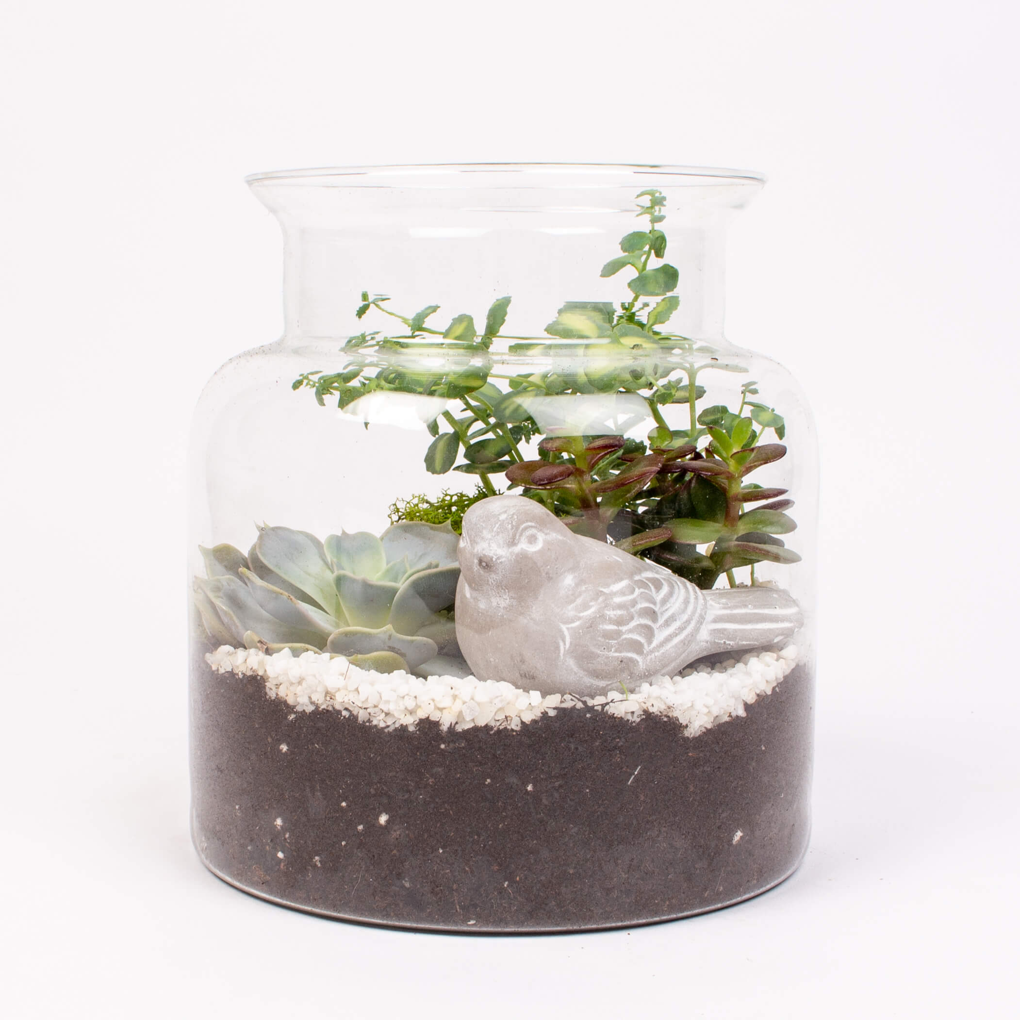 Contine: borcan de sticla (19 x 19 cm), plante cu suculente, pasare de ciment si muschi conservat.