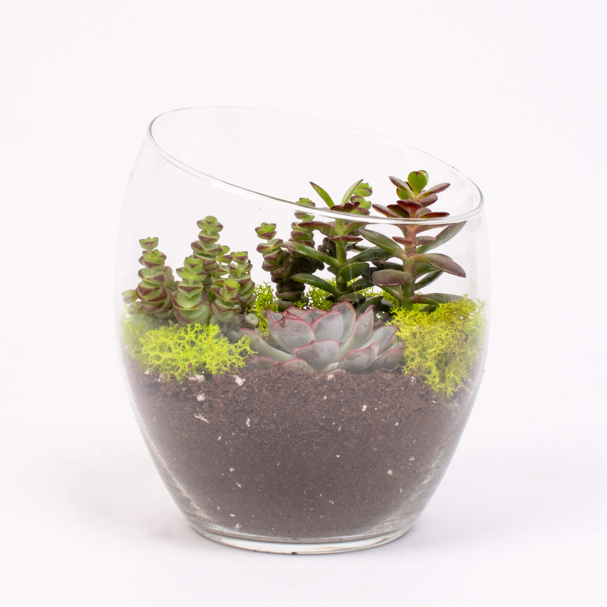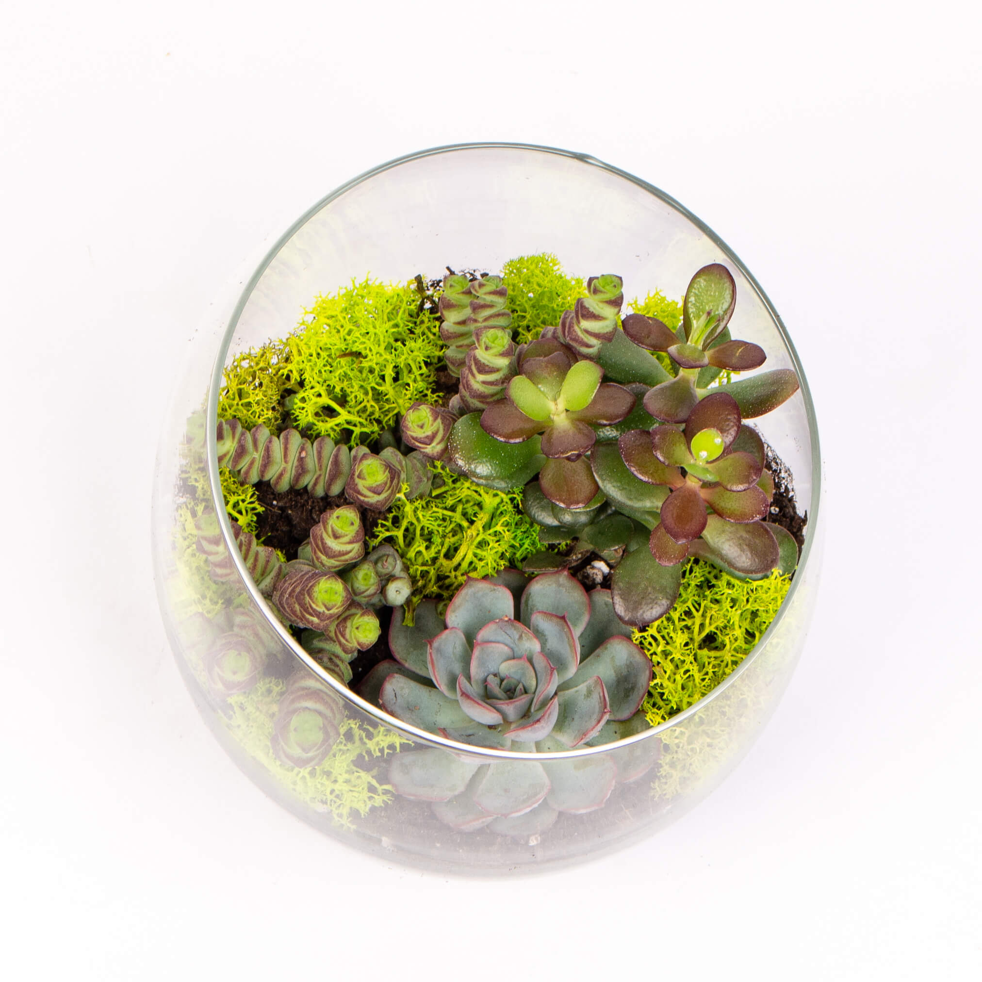 Contine: vas sticla (16 x 20 cm), plante suculente, pietre decorative albe si muschi conservat.