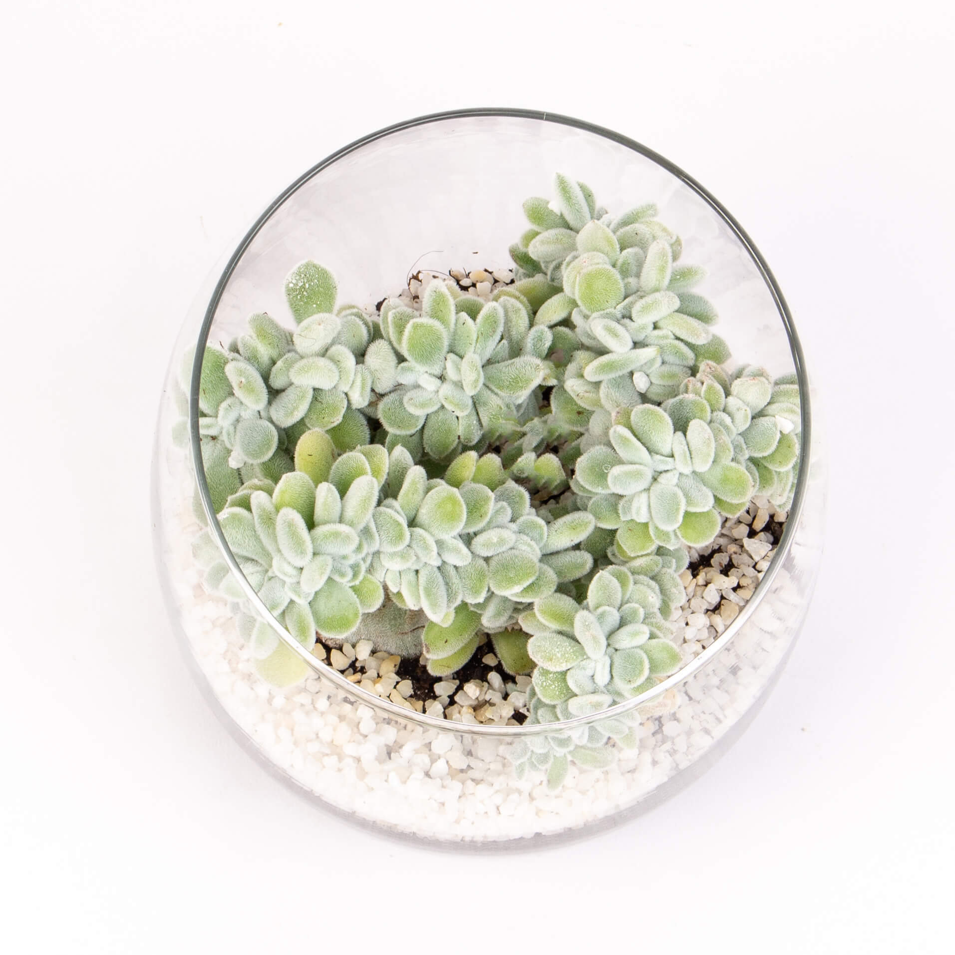 Contine: vas sticla (16 x 20 cm), Echeveria frosty si pietre decorative albe.
