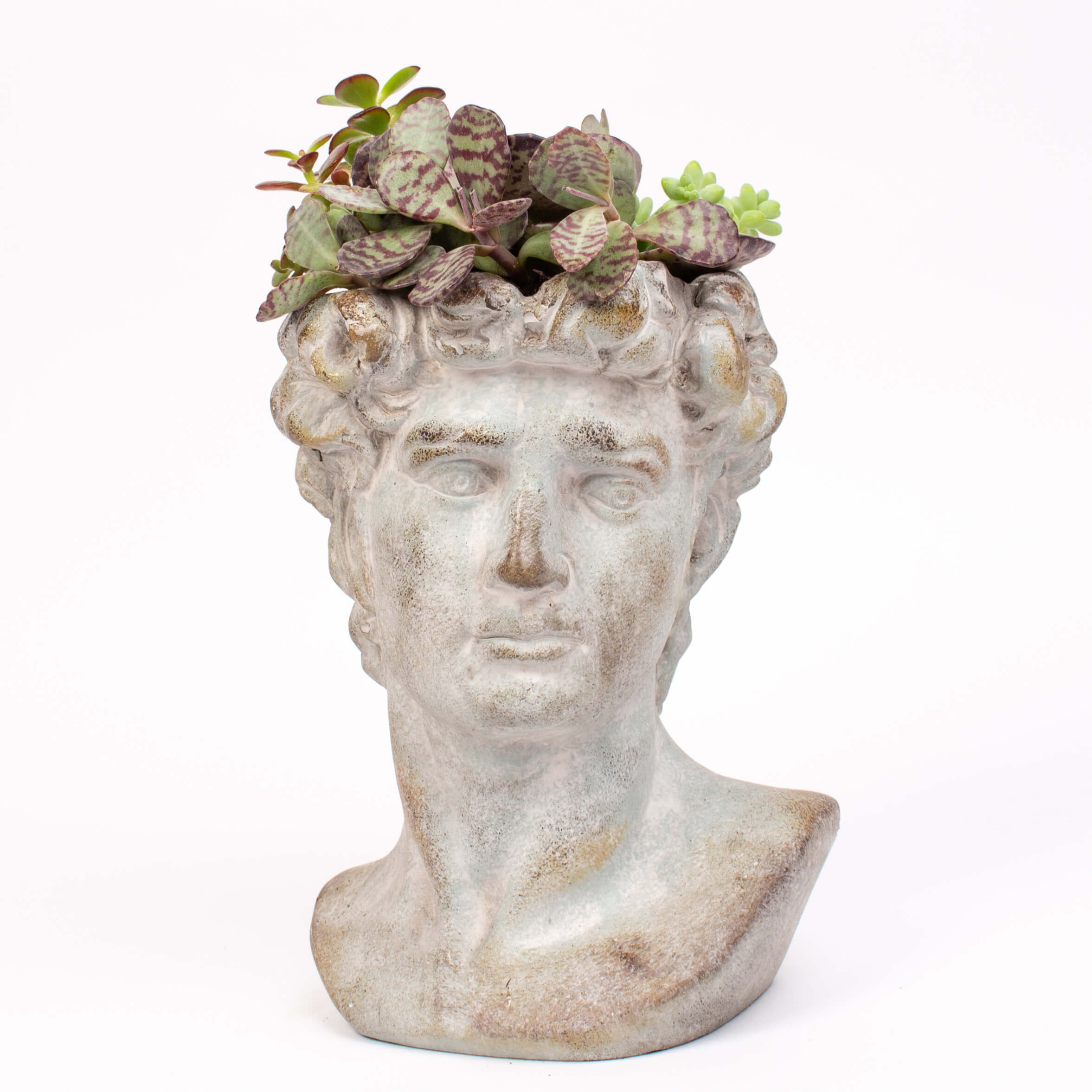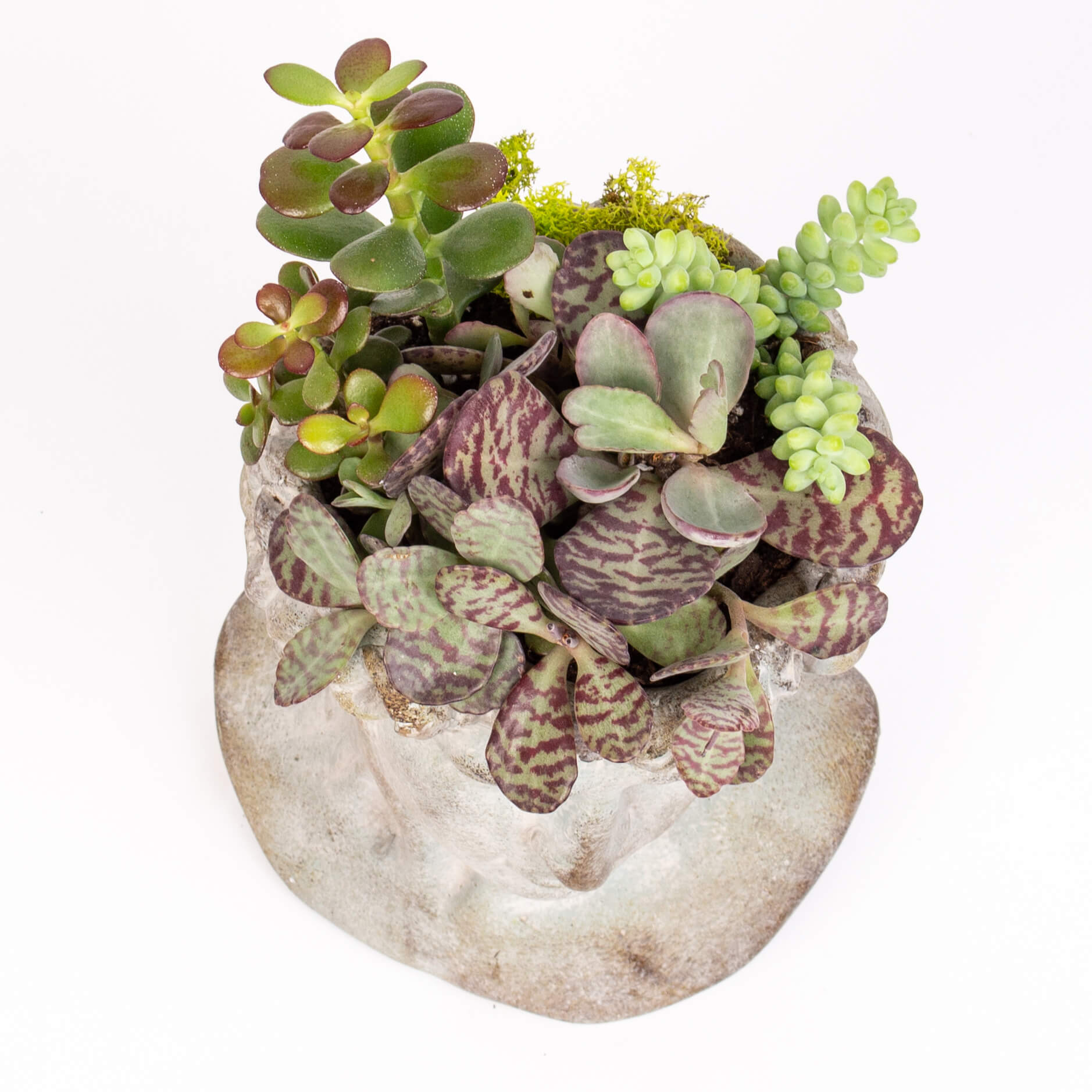 Contine: bust barbat (23 x 17 cm), plante succulente si muschi conservat.