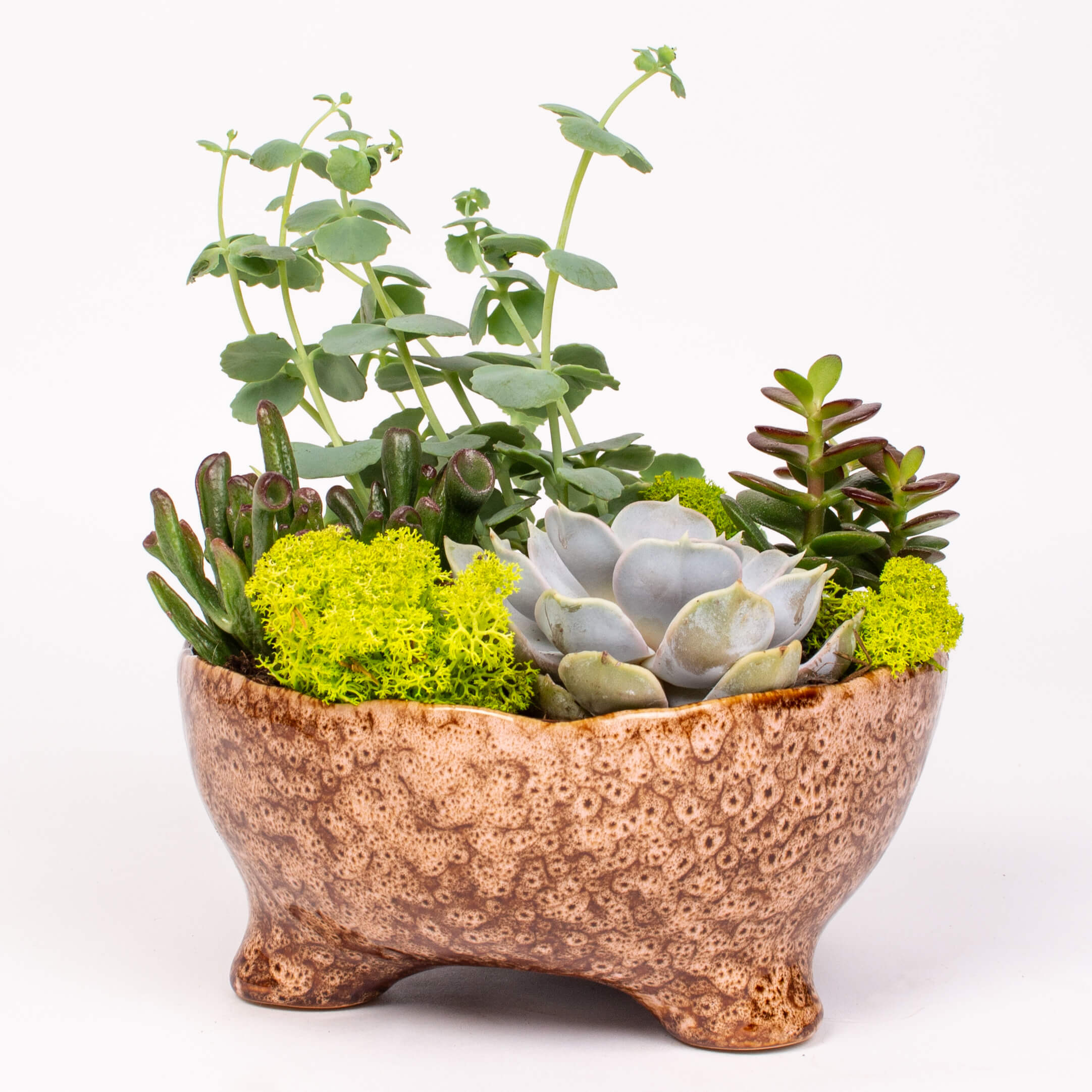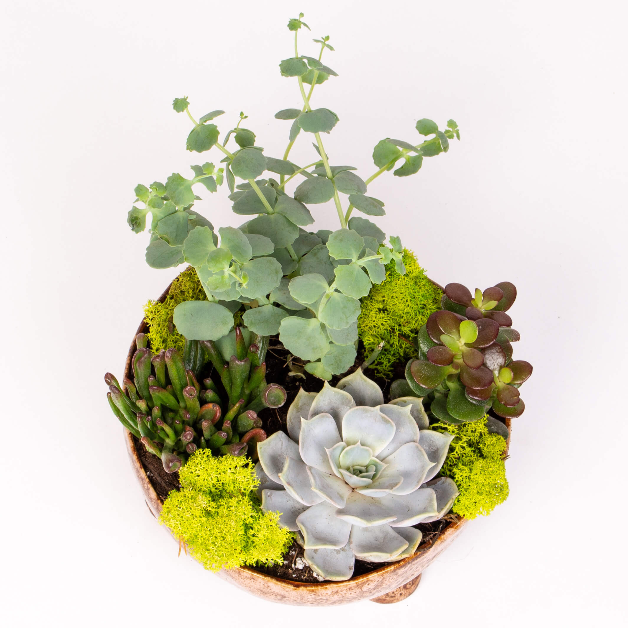 Contine: ceaun ceramic (19 x 9 cm), plante succulente si muschi conservat.