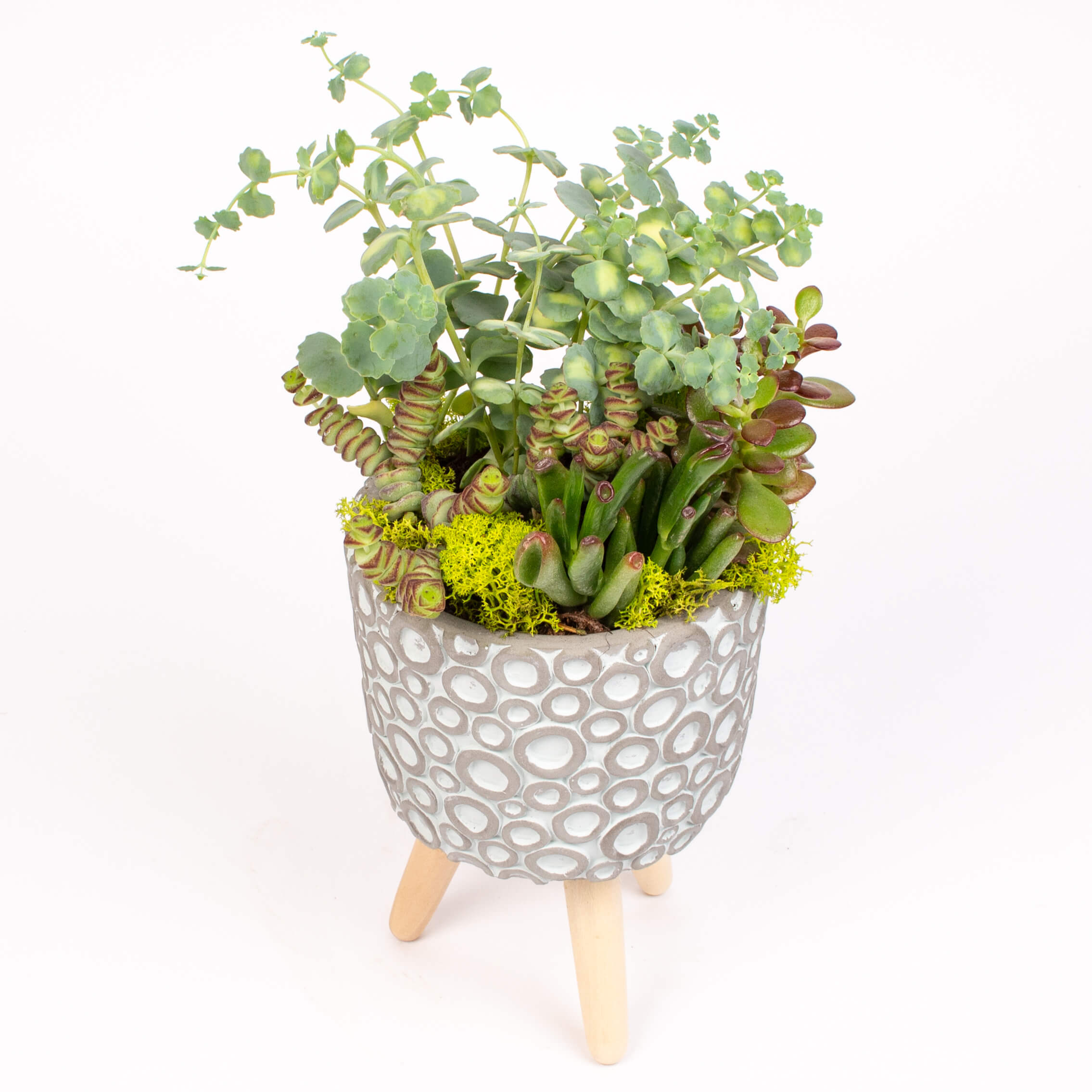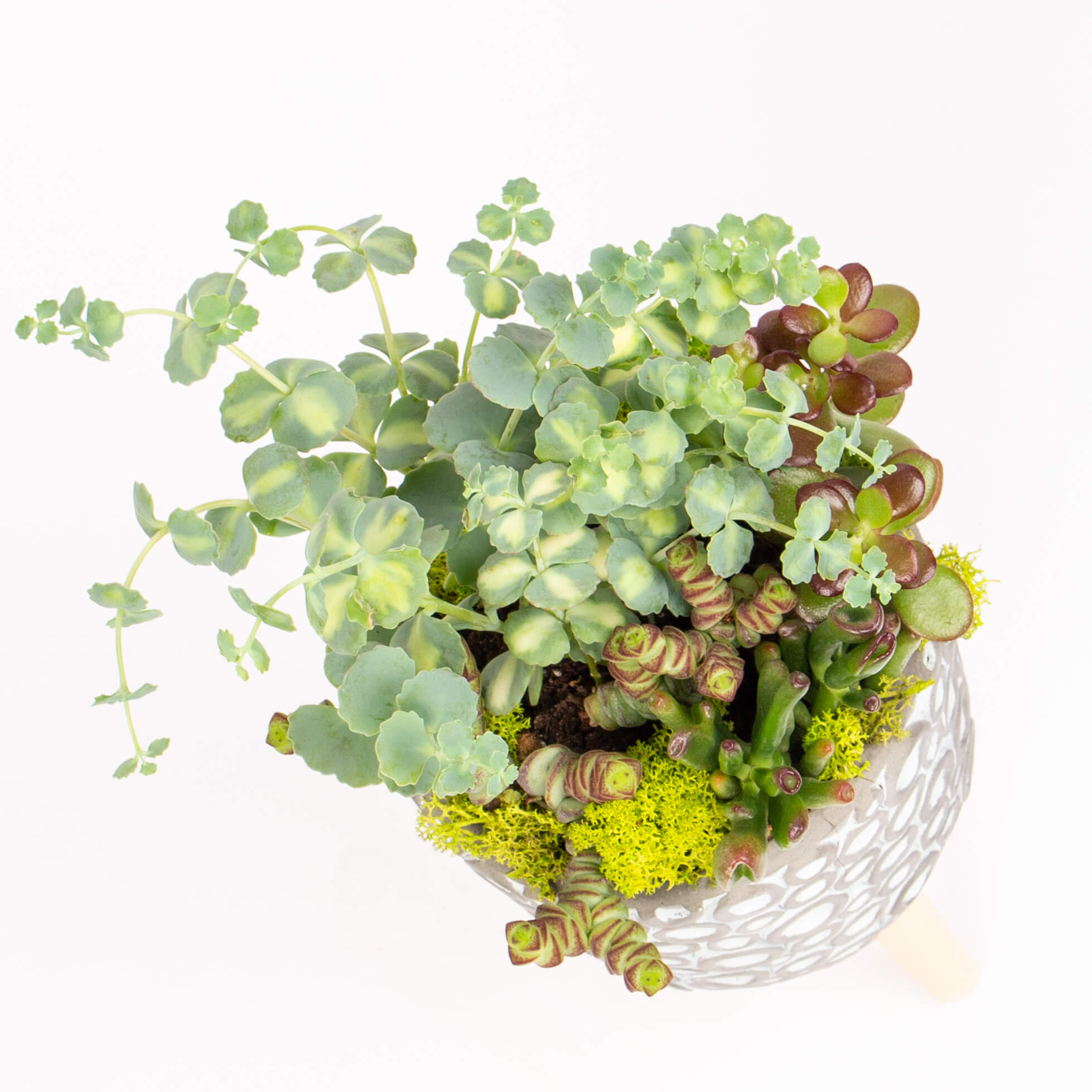 Contine: vas ceramic (13 cm x 18 cm), plante suculente, muschi.