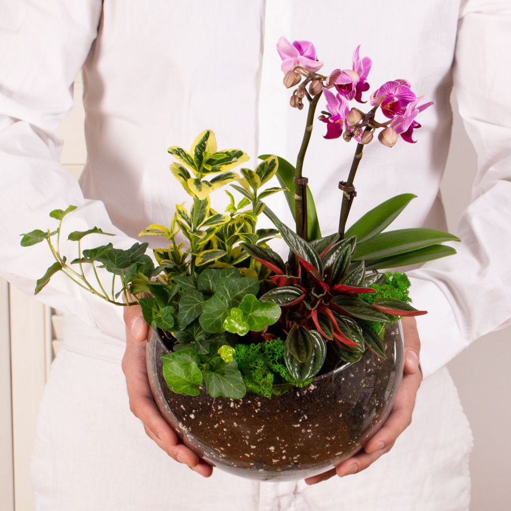 Contine: vas oblic, orhidee, peperomia si alte plante