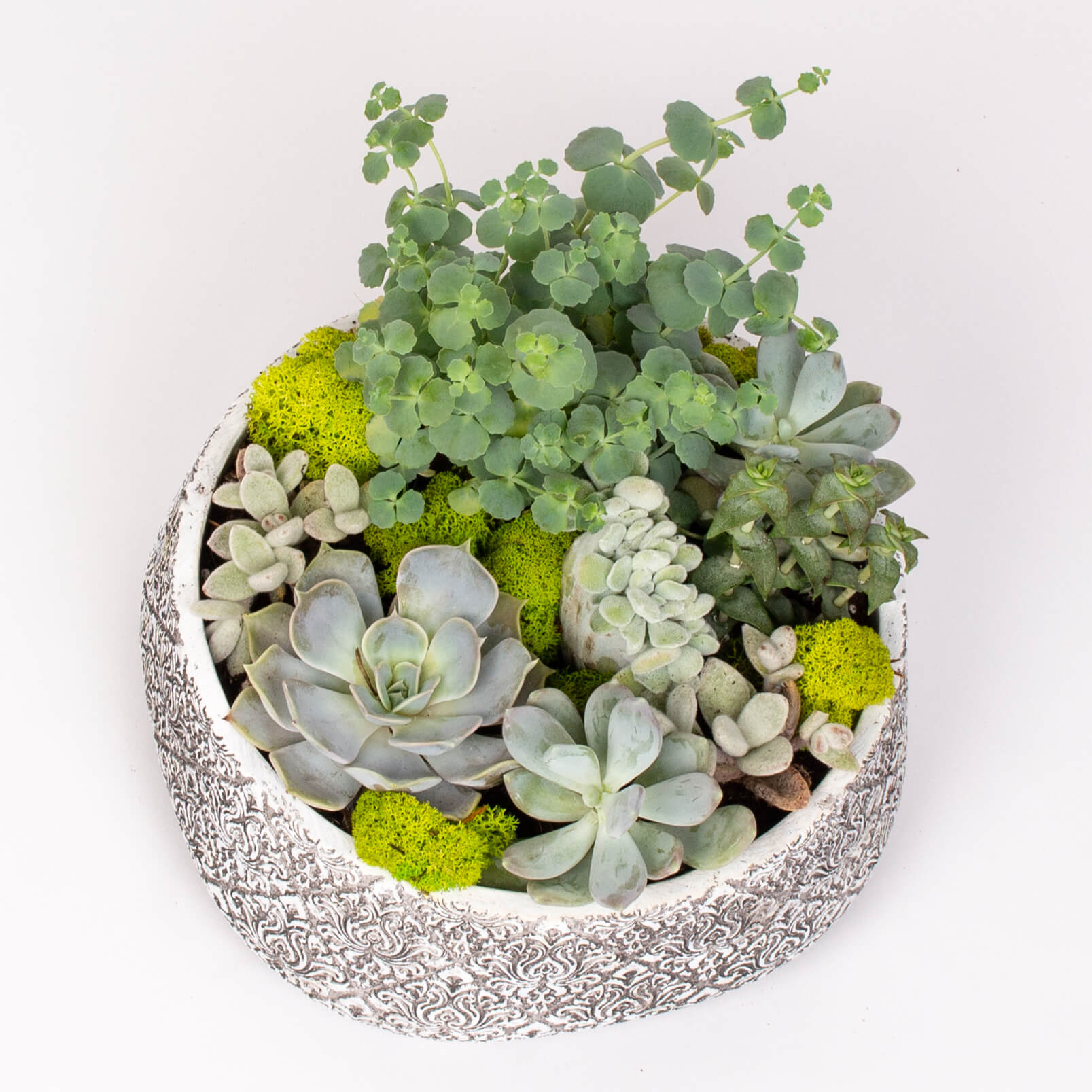 Contine: vas rotund ceramic (25 x 9 cm), plante succulente si muschi conservat.