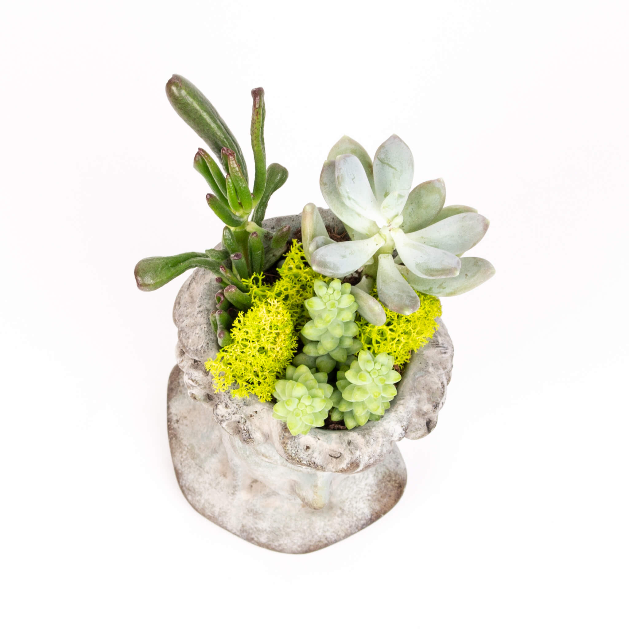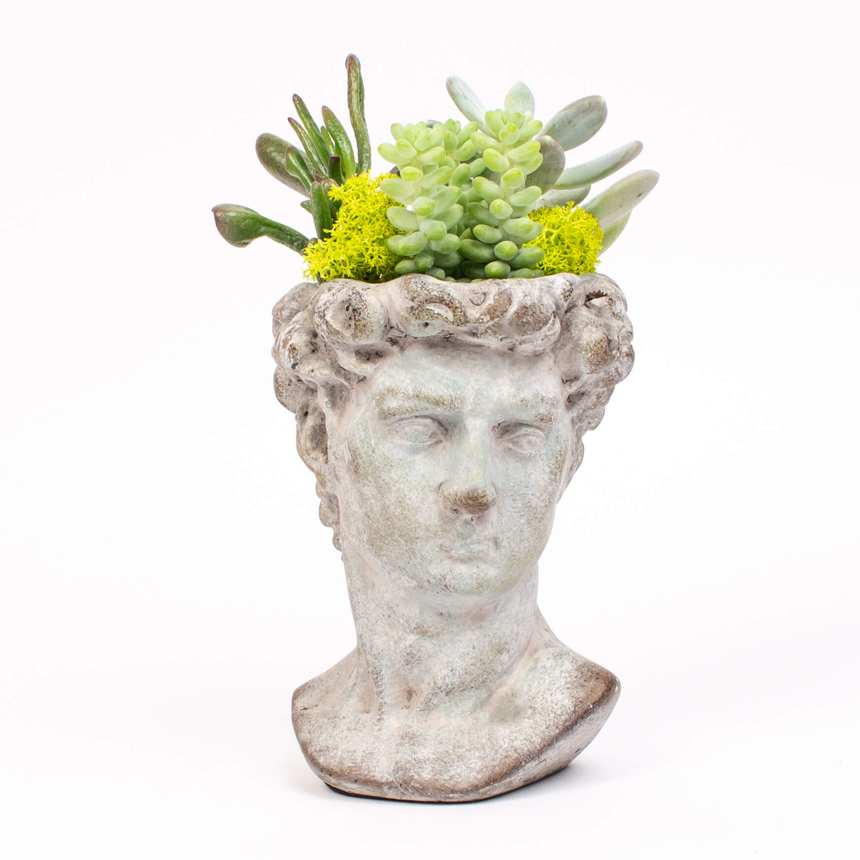 Contine: bust barbat (23 x 17 cm), plante succulente si muschi conservat.